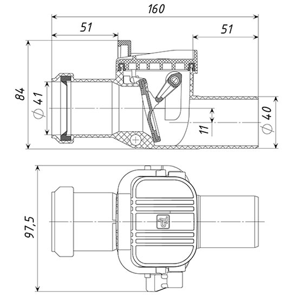 Обратный клапан ТП-86.40. Используется в системах внутренней канализации для труб Dn 40 мм. Клапан предотвращает обратный ход стоков при засоре канализационных магистралей.